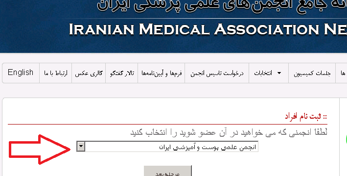 بعد از کلیلک بر روی گزینه ثبت نام اعضا ،گزینه انجمن علمی پوست و آمیزشی را انتخاب کنید (طبق تصویر)